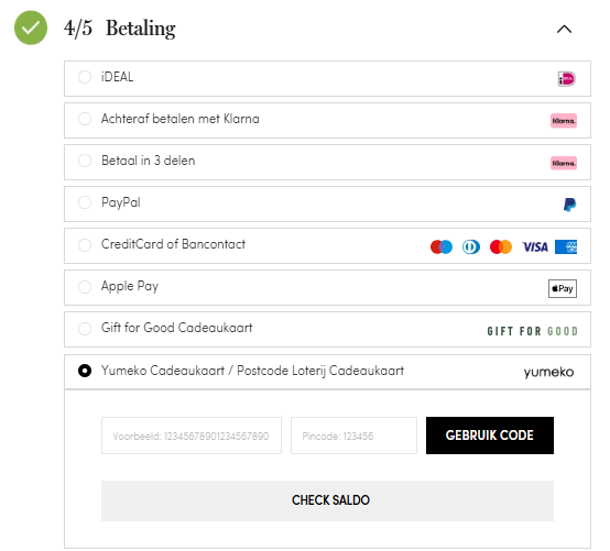 1) Vul je contact- en adresgegevens in(stap 2/5) en selecteer de gewenste bezorgopties (stap 3/5) in. Bij Betaling (stap 4/5) kies je voor “Yumeko Cadeaukaart / Postcode Loterij Cadeaukaart”
